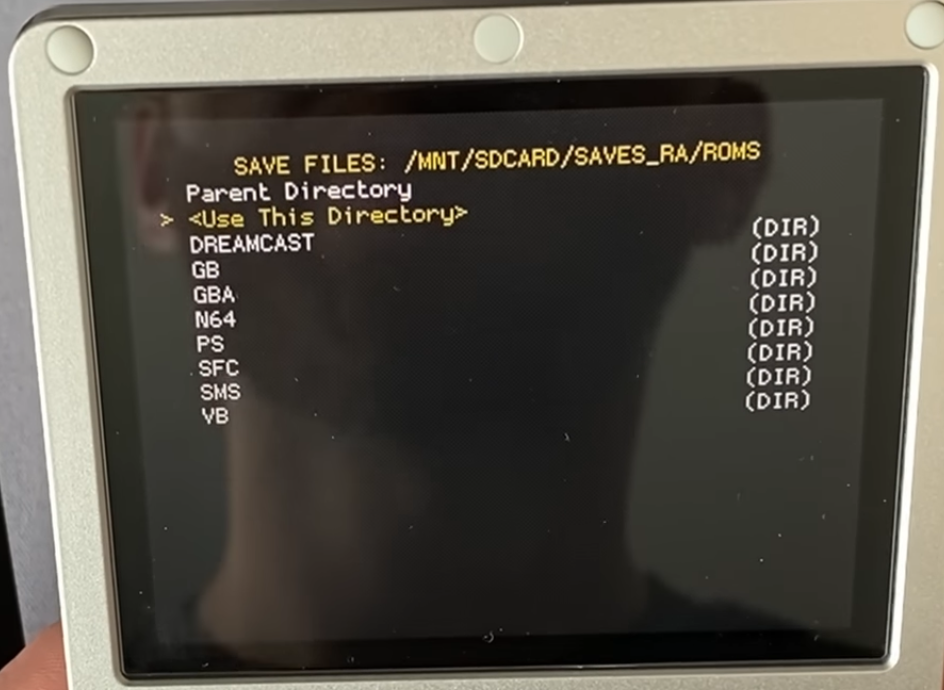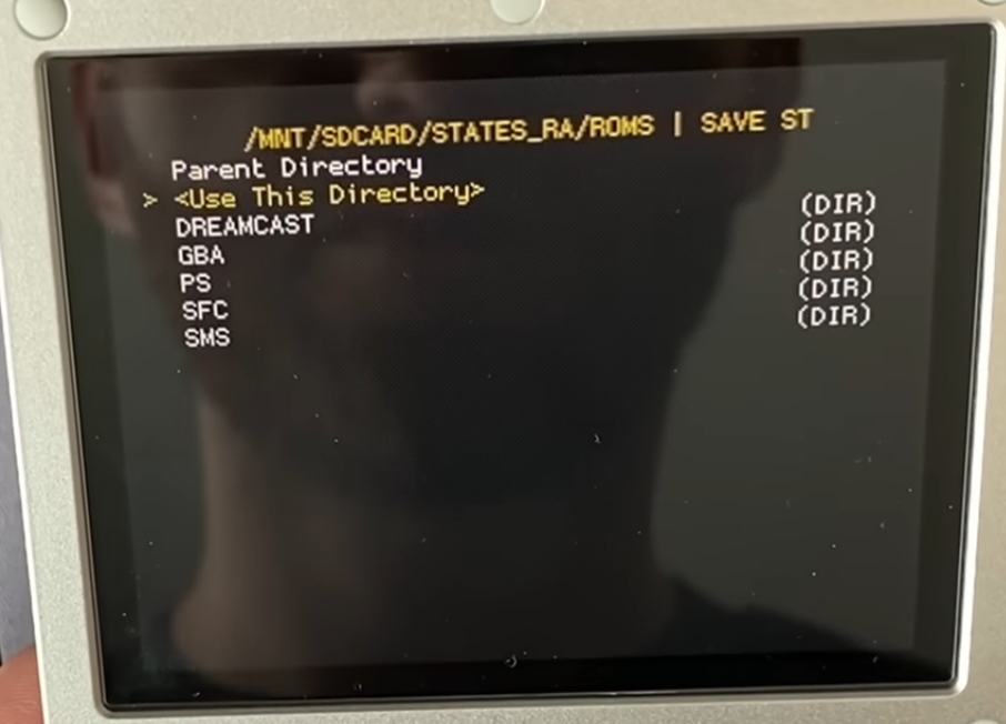 Then head to RA main menu>Settings>Directory>Save Files, select it, and then browse to the location shown below, then choose "Use this directory". Note that you may need to hit "Parent directory" a few times first before you can see the "SDCARD" folder: