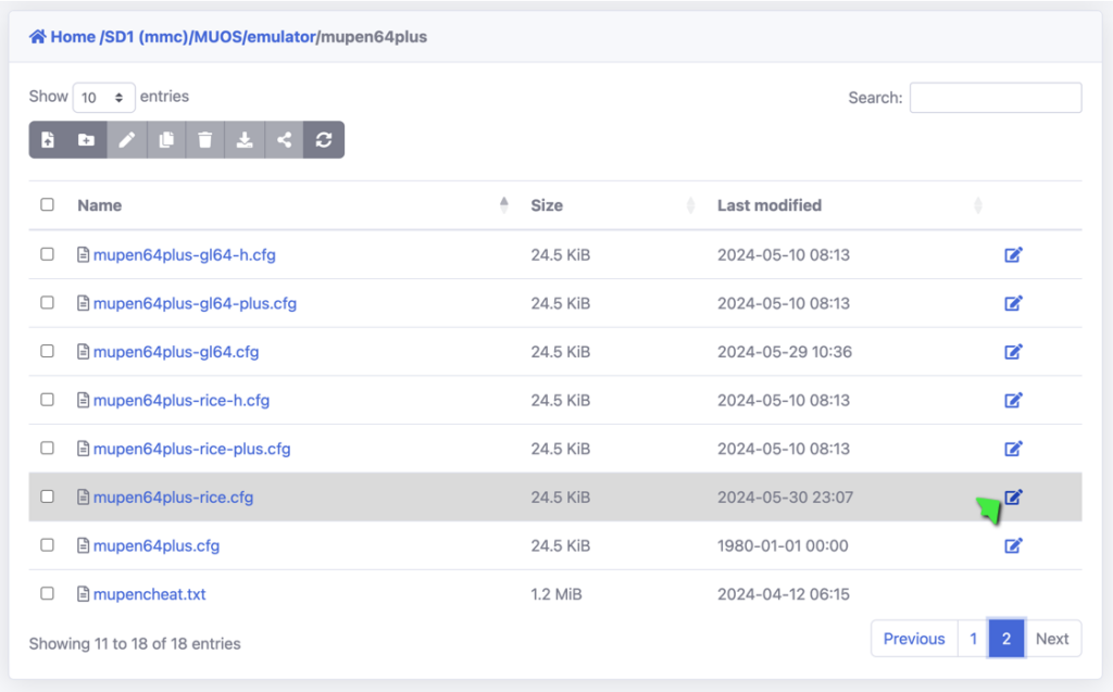 Once you know what version you're using, browse to /SD1/MUOS/emulator/mupen64plus, and then choose the .cfg file that corresponds to your variant of choice. For example, for "rice", I'm editing the "mupen64plus-rice.cfg" file, as shown below.