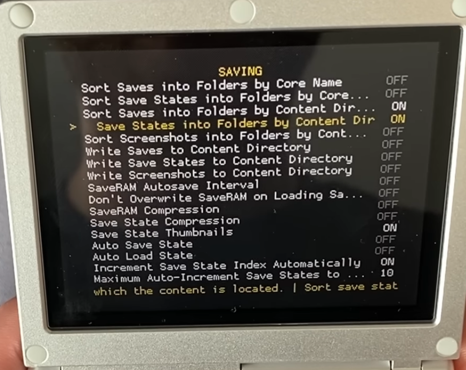 If you plan to flip between muOS and the Anbernic Stock OS often, you'll want to open RetroArch on Stock OS, go to Settings>Saving, and set the top four settings as follows, to match what we set for muOS above: